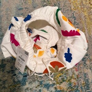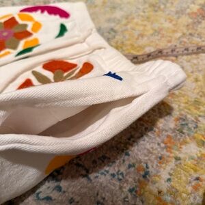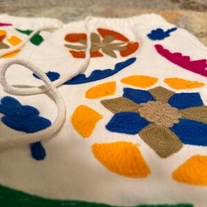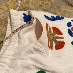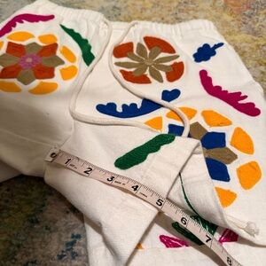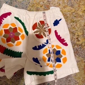 White Zara athletic shorts with bright embroidered floral and leaf motifs. Elastic drawstring waist for easy wear. Bold color accents create a playful look.