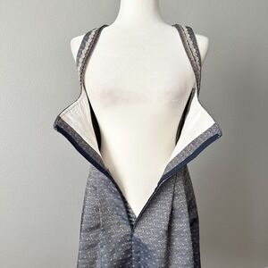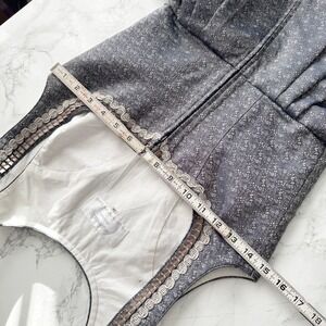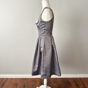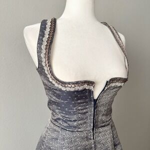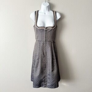 Vintage Angermaier Trachten Dirndl dress in a classic Bavarian folk style. This sleeveless dress features a fitted bodice with decorative trim along the neckline and straps, and a full pleated skirt. Back and front zip closure. Unlined.