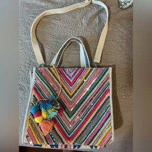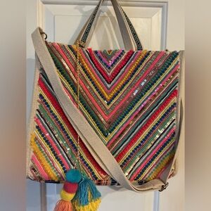 Clean inside and out. Like new. Used once. Includes one detachable strap and Pom Pom as shown in pictures. Colorful multicolor embroidered tote with playful pom-pom accents. Lightweight, versatile carry with cream straps for everyday use. Eye-catching multicolor chevron stitching adds a cheerful, artisan look.