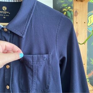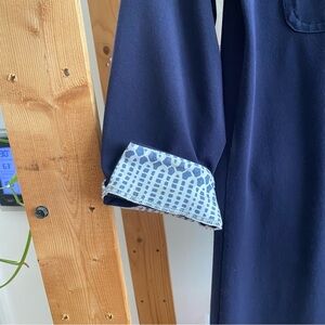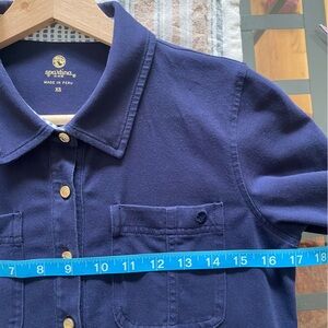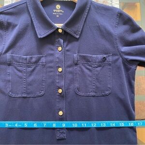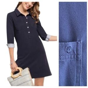 Classic women’s Spartina 449 Navy Blue Camilla Polo Shirt Dress. Short sleeves - sleeve cuff can be flipped to show pattern - collared - gold button placket - chest pockets - classic style