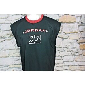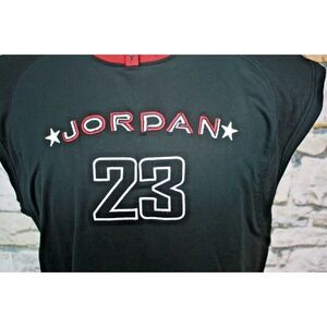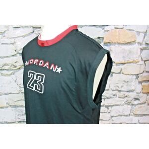 The Jordan 23 NIKE Basketball Jersey is a stylish and comfortable sleeveless jersey in black, featuring embroidered letters on the front. Made from jersey fabric, this top is designed for activewear, specifically for basketball. With a regular fit and crew neck, it is perfect for active occasions and can be worn in the summer, fall, and spring seasons. Made by Nike under the Jordan brand, this large-sized jersey is ideal for men looking for high-quality athletic apparel.