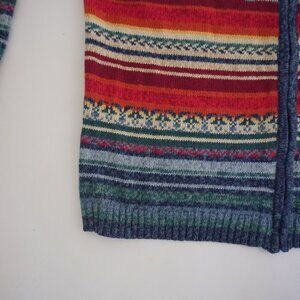This vintage Tiara knit cardigan features rich horizontal striping in layered shades of blue, red, green, and cream, creating depth and visual rhythm across the entire piece. The zip-front design gives it a relaxed, wearable feel, while the mixed stripes add character without overpowering an outfit. The overall look naturally fits a Cabincore aesthetic, evoking lived-in comfort and countryside layering with a collected, intentional feel.