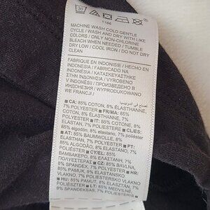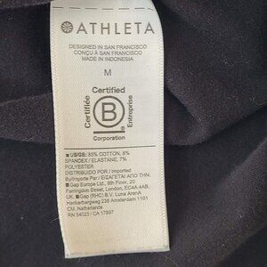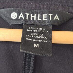 Black athletic top by Athleta featuring a soft stretch fabric blend and a flattering V-neck design. The top includes subtle ruching along the sides that creates gentle shaping through the waist and hips while allowing comfortable movement. Cap-style sleeves and a slightly curved hem give the piece a streamlined silhouette suitable for activewear or casual everyday styling. Athleta was founded in 1998 and became part of Gap Inc. in 2008, known for producing performance-focused apparel designed for yoga, training, and active lifestyles. This garment is labeled size medium and is made from a fabric blend containing cotton, elastane, and polyester for flexibility and breathability. The minimalist black color and clean design make it a versatile athletic top within the Athleta performance apparel line.