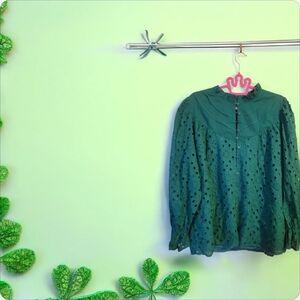 NWOT Dark green eyelet blouse with long sleeves. Features a rounded yoke and button back closure. Lightweight, feminine silhouette. Versatile and easy to style. SIZE XXL