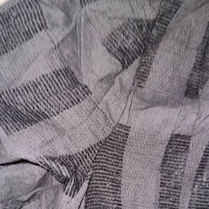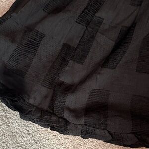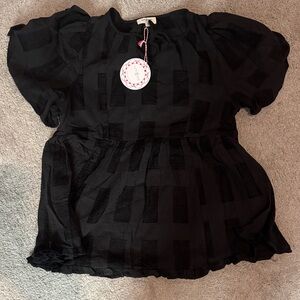 Lightweight black blouse with subtle textured check panels. Puff sleeves and a gathered waist for a feminine silhouette. Soft, flowy fabric for easy styling.