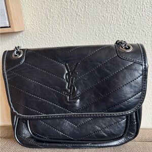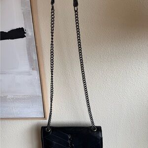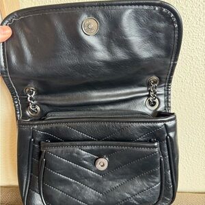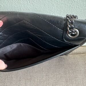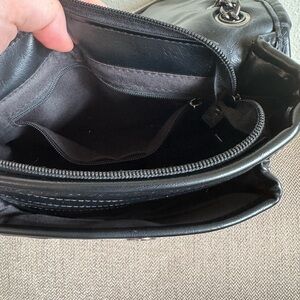 Black quilted leather shoulder bag with signature logo. Sleek chain strap and flap closure for secure, stylish wear. Timeless black design that pairs easily with day or evening looks. Not Authentic!!!!!!