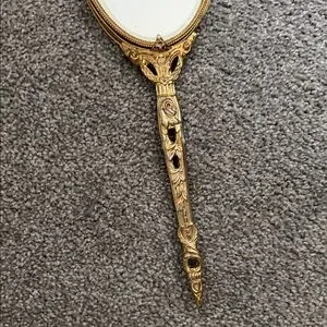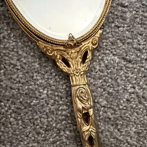 This vintage-inspired handheld mirror features an intricately designed gold frame, adding a touch of elegance to your accessory collection. Perfect for quick touch-ups anywhere.