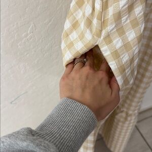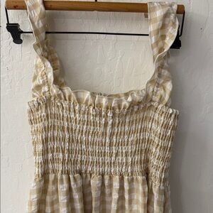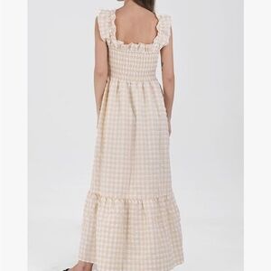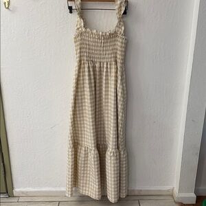 Ruffle Plaid Gingham Long Dress Shirred Stretchy Strap Flowy Retro Dress Beige