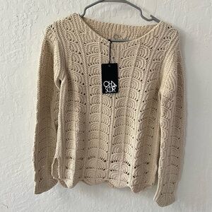 Chaser Cream Knit Crochet Scallop Slit Long Sleeve Pullover Sweater Small