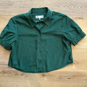 Zara cropped blouse in a deep green shade. Button-front closure with a classic collar. Short sleeves with subtle gathered cuffs. Lightweight, smooth fabric with a clean silhouette. Best for medium
