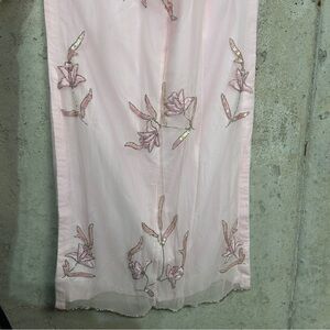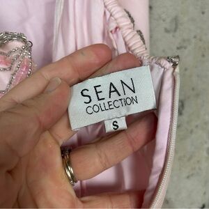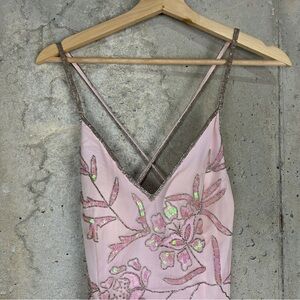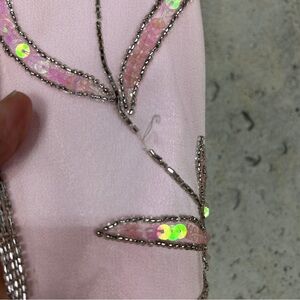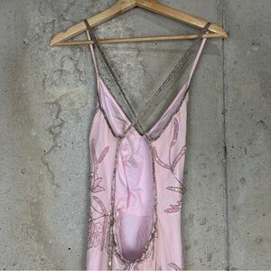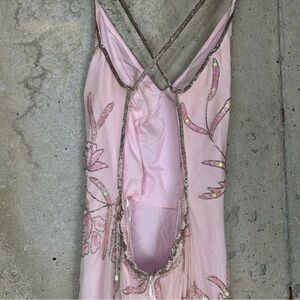 Vintage 90s/y2k Sean collection, baby doll pink chiffon and silk prom dress with side front slip, sequin and rhinestone floral pattern. Spaghetti criss cross strap and zipper closure. Some mild imperfections listed in photos otherwise great condition and would be perfect for prom.