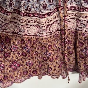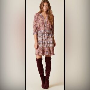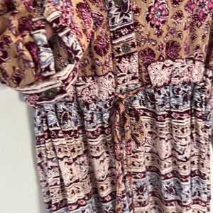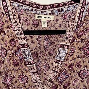 EUC taupe and magenta Billabong Marry Mine paisley dress. Super cute 3/4 sleeve tie waist dress with a little ruffle at the bottom. Buttons up the front into a v neckline. Fits loose.