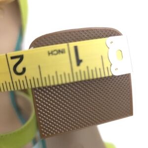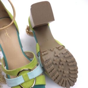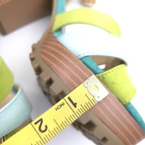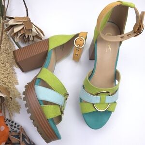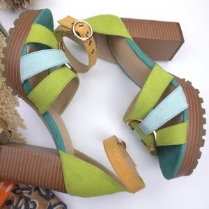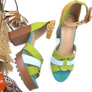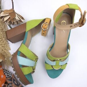 Step out in style with these vibrant platform sandals. Featuring a mix of green and blue hues, these shoes are perfect for adding a pop of color to any outfit. The chunky heel provides comfort and stability for all-day wear.