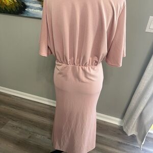 Boohoo blush pink maxi dress. Rounded neckline and short draped sleeves. Elasticated gathered waist for a flattering fit. Smooth, flowing skirt for comfort and movement. Elegant, versatile piece for day or evening.