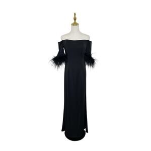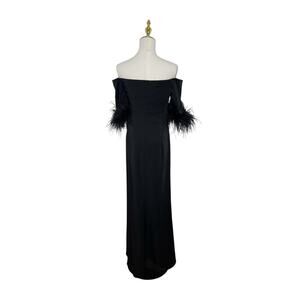 Elegant Ieena for Mac Duggal gown featuring an off-the-shoulder neckline and dramatic sleeves accented with soft ostrich feathers. The sleek, column silhouette creates a clean, refined look, while the feather trim at the sleeves adds texture and statement detail.
