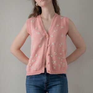 Vintage 90s Pink Cottage Coquette Floral Embroidered Knit Button Front Women's Sweater Vest