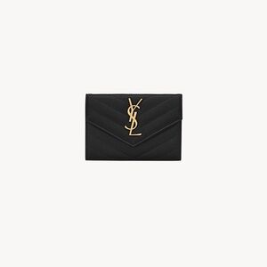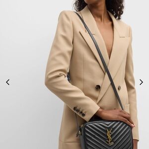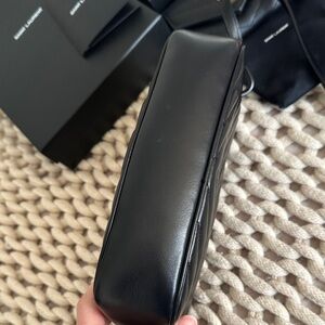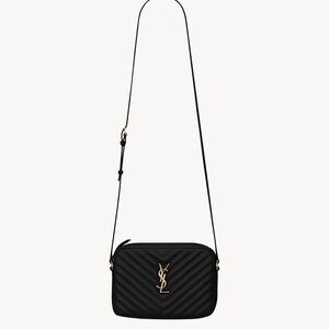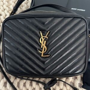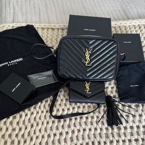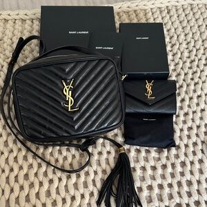 Saint Laurent crossbody camera bag in chevron-quilted black leather. Gold YSL logo hardware on bag and matching wallet. Sleek, structured silhouette for everyday wear. Both in great condition. Wallet NWOT. Bag used a few times. includes everything shown. See pics for close ups
