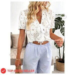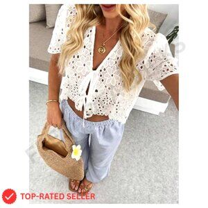 Boho Floral Lace V Neck Crop Top Tie Front Short Sleeve Blouse Chic