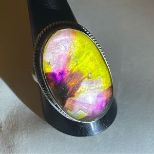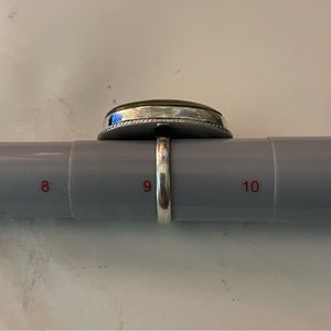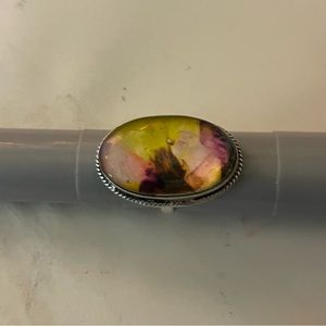 This gorgeous one-of-a-kind Oval shaped, Ammolite is very rare. This ring comes in 925 sterling silver (stamped) and handmade by me! Cut and polished. Minded in Boeny, Madagascar This ring is safe for every day use as well as safe in water. Store in a cool dry cloth box or pouch.