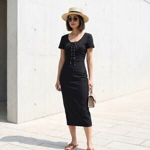 - Midi slip-style dress with short sleeves, a V-neckline, and a collar detail with an adjustable bow