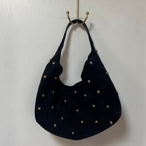 Crafted from suede embellished with studs, this bag strikes a fine balance between functionality and sophistication. Featuring a slouchy silhouette with a comfortable shoulder strap, it has a spacious interior with a zip pocket to hold all your essentials and secures with a magnetic closure.