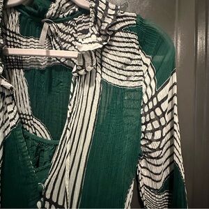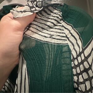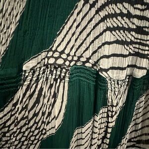 Gorgeous maxi with ruffled accents throughout on pleated fabric. Chic green, white & black pattern. Two tears: one on front of left shoulder & one on front hem (as shown in photos). Could potentially be patched but unfortunately, I don’t have the skill set to do so. I believe there may be one additional tear in similar size to the one on the front shoulder, but I’m not able to locate it. The tears due blend in quite well, but I am not graceful enough to continue wearing for fear of additional rips. Price reflects damage.