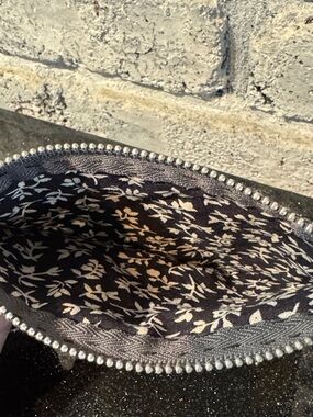 Vintage Peruvian Colorful Bird Embroidered Pouch. Black with yellow blue orange red pink and green tones. Interior has a floral pattern.