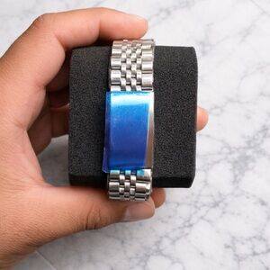 Elegant stainless steel watch with a light mother-of-pearl dial. Gold-tone hands and date window at 3 o'clock. Sparkling crystal hour markers. Classic linked bracelet and fluted bezel.