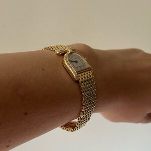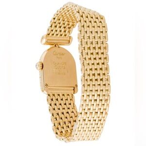 Rare Cartier watch in 18k gold. Shown on a 6.5 inch wrist. Luxurious Cartier watch featuring a gold bracelet. Adorned with sparkling diamond accents.