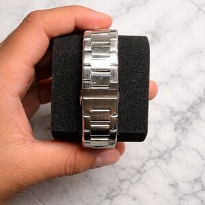 Sleek stainless steel analog watch with a playful white dial that says "Who cares I'm already late." Comfortable silver bracelet and easy-to-read hands. Modern casual style with a humorous touch. Includes silver finish and white face for versatile everyday wear.