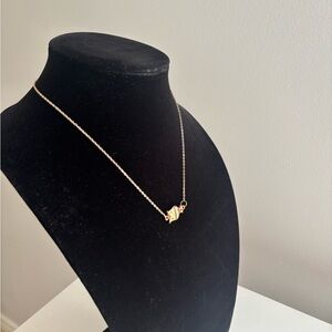 Delicate gold tone necklace featuring a small owl pendant with yellow and orange enamel accents. Lightweight chain and charming pendant for everyday wear. Adds a playful pop of color to any outfit.