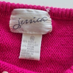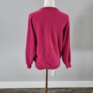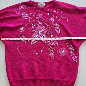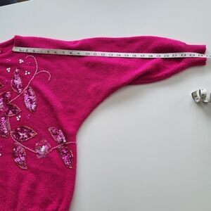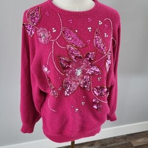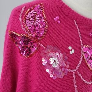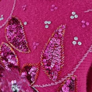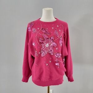 Beautiful pink sweater with glitzy sequin embellished flowers. Size medium, please see photos for measurements. some of the pink sequins are loosing their color, see photos. Overall good vintage condition with some pilling throughout. No shoulder pads.