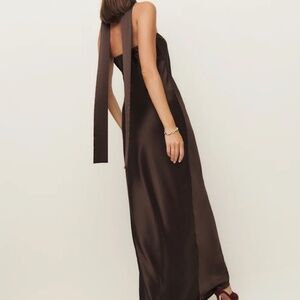 Reformation Oren Silk Dress in Black Bean. Women's Size M / Medium. Features lightweight charmeuse fabric, strapless, elastic band at the top, sleeveless, straight neckline, an a line silhouette, and separate matching scarf. relaxed fit throughout, lined, long length. 100% silk. Never worn, never altered. Brand new with tags.