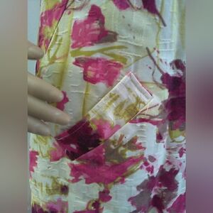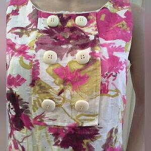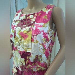 Sleeveless floral shift dress with bold pink blooms. White base with gold accent detailing. Decorative front buttons for a chic finish. Easy, feminine silhouette for daytime wear. THIS IS A BEAUTIFUL DRESS MADE FROM COTTON WITH GORGEOUS PATTERNS OF COLORS AND FLOWERS. IT IS LINED ALS. IT HAS THE DECORATIVE BUTTONS AND POCKETS. TE LATER AL S TEXTURED WHICH IS REALLY PRETTY IN PERSON.