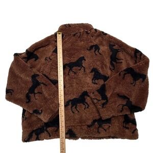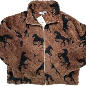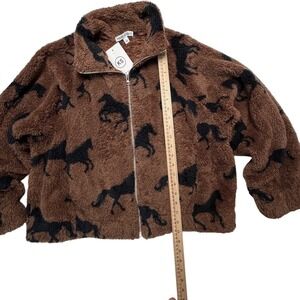 Knapp Studio Horse Print Fleece Jacket Brown Black Full Zip Sherpa NWT Large Equestrian Western Boho Indie Festival Lightweight