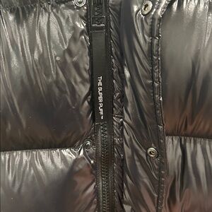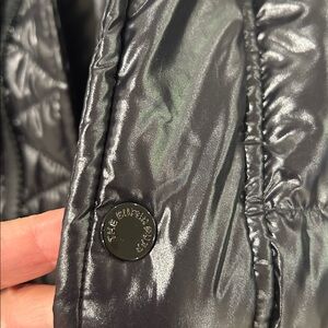Long black puffer coat from Aritzia. Quilted, glossy finish. Hooded with full front zip and snap closures. Warm insulated fill. Sleek, streamlined silhouette.