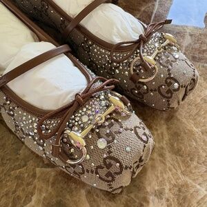 Stunning authentic Gucci crystal GG ballet flats featuring the iconic monogram canvas with sparkling crystal embellishments throughout. This rare Gucci style combines classic elegance with a subtle touch of glamour, making them a standout piece for any designer collection.