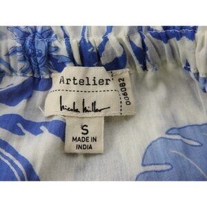 🌺 Details • Brand Artelier Nicole Miller • Size Small • Color Blue And White • Tropical Island Print Palm Trees Flowers Sunsets • Off Shoulder Elastic Neckline • Layered Ruffle Detail Across Top • Lightweight Breathable Cotton • Made In India • 100 Percent Cotton
