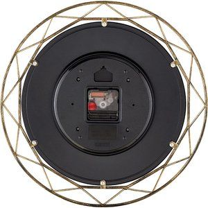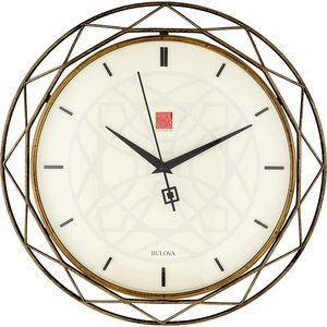 Bulova wall clock with an antique gold metal frame. Clean cream dial with easy-to-read black markers and sleek black hands. Stylish geometric outer frame adds modern elegance. Perfect for elevating living spaces with a subtle gold tone.