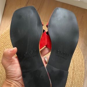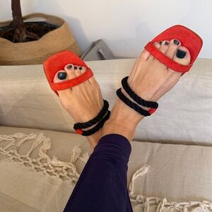 Anthropologie New Howsty Flat Slide Coral Red Suede Black ❤️ Chic size 6.5 to 7