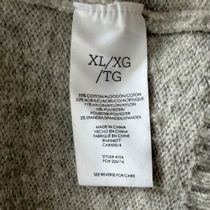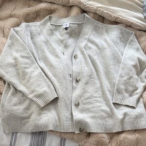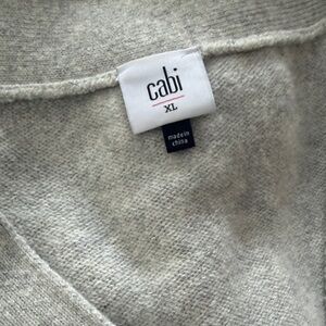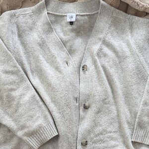 Classic CAbi women's Snug cardigan in a soft light gray. V-neck with button-front closure. Oversized, Ribbed cuffs and hem for a tidy finish. Lightweight and versatile for layering. Sz XL