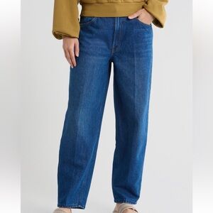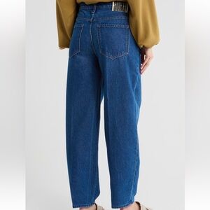 Go casual in these high-waisted ankle-length jeans cut in a barrel-leg silhouette from soft cotton-blend denim.