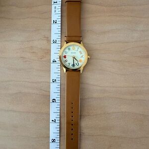 Elegant watch featuring a gold case and tan leather strap. Instead of traditional hour markers, the white starburst face is decorated with colorful lucky charms, including: