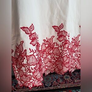 This elegant dress features a stunning white base with intricate red embroidery. Perfect for any occasion, it combines style and comfort effortlessly.