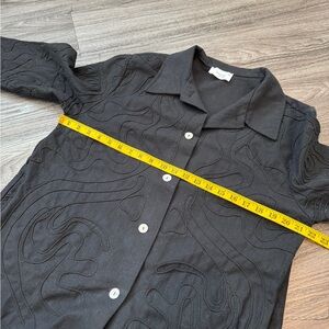 Textured black button up (or can be a light jacket) in a linen/viscose/cotton blend. Has a 3d texture on the front and sleeves. See video for best visual.