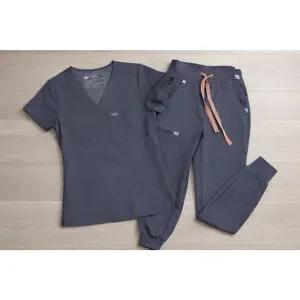 FIGS Technical Collection Scrub Set in Graphite Gray. Includes matching V-neck scrub top and jogger scrub pants. Lightweight, comfortable, and designed for durability and performance in healthcare settings.
