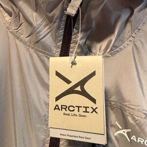 Arctix colorblock windbreaker with full zip and hood. Chest zip pocket and side zip pockets for storage. Elastic cuffs and hem for a secure fit. Lightweight, water-resistant shell for everyday wear.