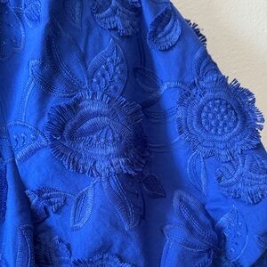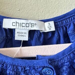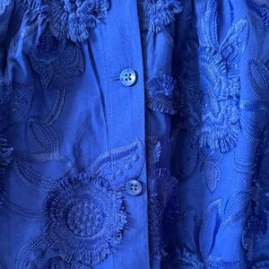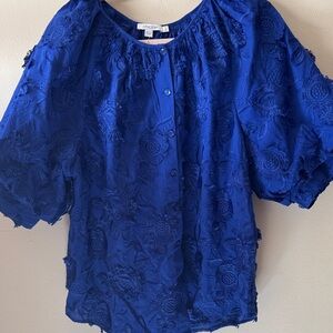 Chico's blouse in vivid cobalt blue. Floral appliqué texture across the front. Button-front with gathered neckline. Voluminous puff sleeves for a feminine silhouette.