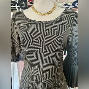 Classic LuLaRoe midi with bold black and gold geometric print. Scoop neckline and elbow-length sleeves. Pleated skirt adds soft movement. Smooth knit for comfortable wear. Versatile monochrome style.