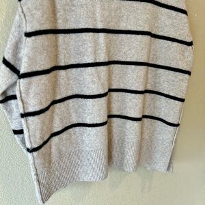 Soft oatmeal sweater with bold black stripes. Perfect for layering and casual wear.
